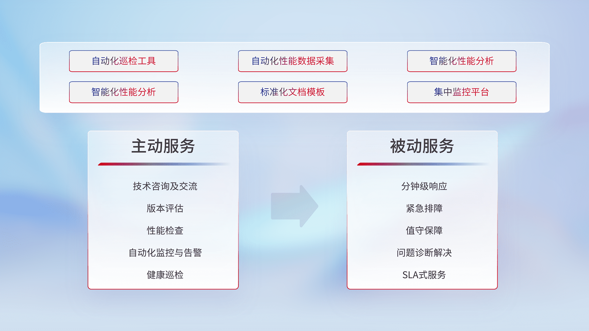 智能化工具和标准化文档,,保障服务质量,,,提供主动服务(包含技术咨询、、、、版本评估、、、、性能检查、、自动化监控与告警、、、健康巡检)和被动服务包含(分钟级响应、、紧急排障、、值守保障、、、、问题诊断解决、、SLA服务)。。。